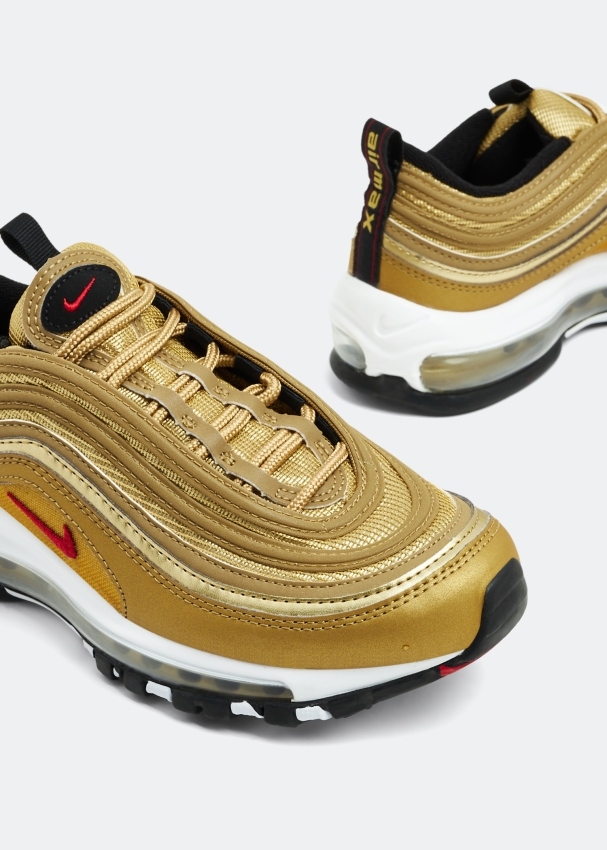 احتفالاً بالذكرى الخامسة والعشرين لنمط إير ماكس 97 الشهير، تُعيد نايك تقديم الحذاء بكتل لونية من الذهبي المعدني، "يونيفيرسيتي ريد"، الأسود والأبيض. يتميز بجزء علوي من نسيج شبكي مع تفاصيل عاكسة، طبقات من الجلد بنمط مموج، وحدة "إير ماكس" وشعار السووش الشهير باللون الأحمر للمسة نابضة بالحياة.